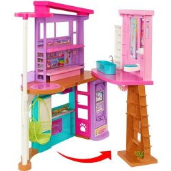 Tento Barbie® Párty dom v Malibu inšpiruje k nekonečným hrám vďaka dvom poschodiam a šiestim hracím zónam vrátane spálne, kúpeľne, kuchyne, jedálne, obývacej izby a šatne. Deti sa môžu rovno nasťahovať a rozprávať akýkoľvek príbeh vďaka viac ako 30 predmetom, a to vrátane zábavného vybavenia, ako sú stoličky, jedálenský stôl s pripojiteľnou doskou a ďalšie. Zábavné detaily a moderné povrchové úpravy otvárajú dvere všetkým druhom rozprávacích hier, štýlová hojdacia stolička sa môže pohybovať hore a dole a slúžiť ako výťah a celá sada sa dá zložiť na jednoduché upratovanie a prenášanie. Bábiky sa predávajú samostatne. Farby a vzhľad výrobku sa môžu líšiť.